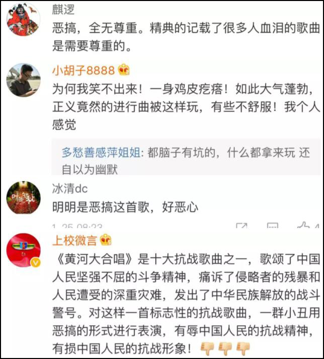 在微博上可以搜索到一些《黃河大合唱》的惡搞版,原本的合唱歌曲似乎成了小品表演。