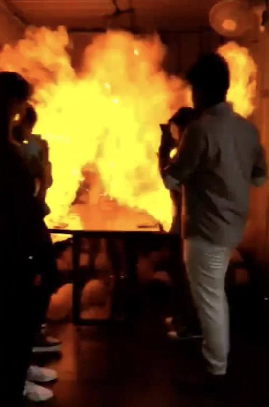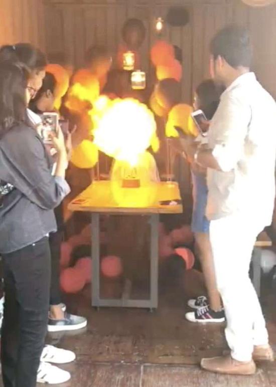 視頻剛開始的畫面是女孩準(zhǔn)備點(diǎn)燃生日蛋糕上的蠟燭,她的朋友們紛紛簇?fù)砩蟻?,用手機(jī)拍照,想要為她記錄這幸福的一刻。畫面中,女孩身穿一件灰藍(lán)色連衣裙,左臂內(nèi)側(cè)紋著一枚與眾不同的紋身圖案,四周被數(shù)十個(gè)粉色以及黑色的氫氣球圍繞著,接下來她劃了一根火柴,點(diǎn)燃了生日蛋糕上的蠟燭準(zhǔn)備許愿,緊接著,附近的氫氣球就突然發(fā)生了爆炸。房間里瞬間升起了巨大的火球,女孩也被火焰圍繞,她和朋友們都嚇得尖叫了起來。