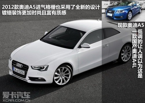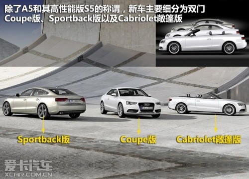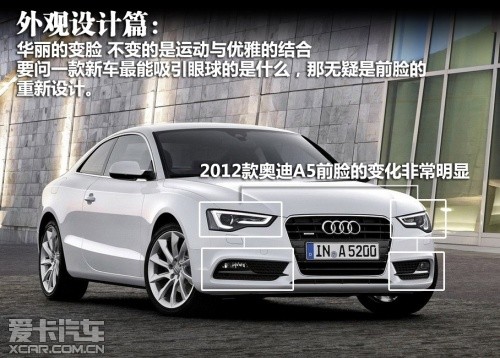 2012款奧迪A5屬于中期改款車型,在外觀、內(nèi)飾、動力和底盤上都有較為明顯的變化。除了A5和其高性能版S5的稱謂,新車主要細分為雙門Coupe版、Sportback版以及Cabriolet敞篷版。