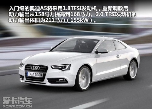 入門級的奧迪A5將采用1.8TFSI發(fā)動機,重新調(diào)教后,動力輸出從158馬力提高到168馬力。2.0 TFSI發(fā)動機的動力輸出依舊為211馬力(155kW)。