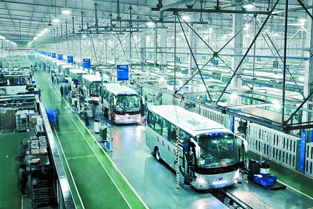 4月19日,現(xiàn)代化的宇通客車(chē)生產(chǎn)線正快速運(yùn)轉(zhuǎn)。今年一季度,鄭州宇通客車(chē)股份有限公司共銷(xiāo)售各類(lèi)客車(chē)10168輛,成為行業(yè)內(nèi)唯一超過(guò)萬(wàn)輛的企業(yè)。其中,共出口各類(lèi)客車(chē)1531輛,出口額達(dá)到了10.12億元,出口量和出口額均名列行業(yè)第一。 河南日?qǐng)?bào)記者 王 錚 攝