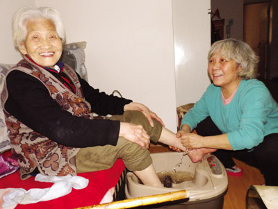 不是親人,勝似親人。圖為68歲的郭薇(右)為96歲的養(yǎng)母郭秀珍洗腳。
