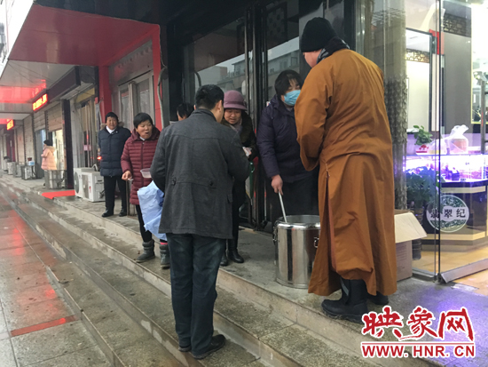 5日早上7點(diǎn)雖然下著小雨,滎陽(yáng)市康泰路于廣武路交叉口西約100米路北,一家“翡翠紀(jì)”的店門口前卻是熱鬧非凡,一名身著僧服的僧人正在給過(guò)往市民從保溫桶里盛出熱氣騰騰的臘八粥。商家老板,上學(xué)學(xué)生,環(huán)衛(wèi)工人等紛紛來(lái)到門前,端著臘八粥喝了起來(lái)。