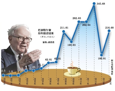過去的這15次拍賣共籌集了約1780萬美元。最低中標(biāo)價格為2001年的1.8萬美元,最高為2012年的346萬美元,至今記錄仍未被打破。去年的巴菲特午餐是由新加坡的Andy Chua出價216.68萬美元競得。