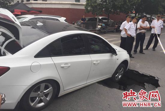 映象網(wǎng)訊(記者 駱瓊 王寬 文/圖)鄭州一條路又塌了,一個(gè)私家車被“坑”在了十字路口。8月17日中午12時(shí)15分,市民王女士開車行至經(jīng)二路緯四路交叉路口時(shí),突然地面下陷,車輛右前輪懸空,目前無法行駛。