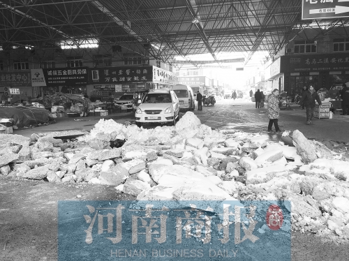 市場(chǎng)內(nèi),在距離大門不遠(yuǎn)處的主干道上,約30米長(zhǎng)、8米寬的路面被挖得支離破碎,無法通行。因該交易中心與水果市場(chǎng)接壤,水果市場(chǎng)的東門尚可出入,但在兩市場(chǎng)的接壤處,有兩處地面也被挖掘機(jī)破壞,步行都很難通過。