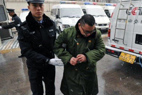 尹相杰頂著雪穿著綠色軍大衣被法警帶進(jìn)法院,等候?qū)徖?。朝陽法院供圖