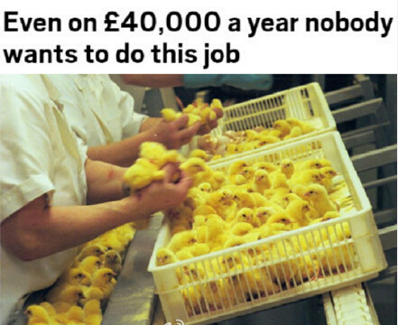 小雞性別鑒定師! 大概一天要看800-1200只小雞的屁屁鑒定他們的性別。。。 年薪4萬(wàn)英鎊。。。 英國(guó)現(xiàn)在都沒(méi)人愿意去做這個(gè)。。也許一天還好。。。你能忍受成年累月的看雞屁屁么-。-?
