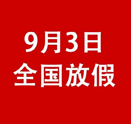 國務(wù)院發(fā)通知:中國人民抗日戰(zhàn)爭(zhēng)暨世界反法西斯戰(zhàn)爭(zhēng)勝利70周年紀(jì)念日(9月3日)放假一天!為方便公眾安排假日期間生產(chǎn)生活,特作如下調(diào)休:9月3日至5日調(diào)休放假,共3天。其中9月3日(星期四)放假,9月4日(星期五)調(diào)休,9月6日(星期日)上班。