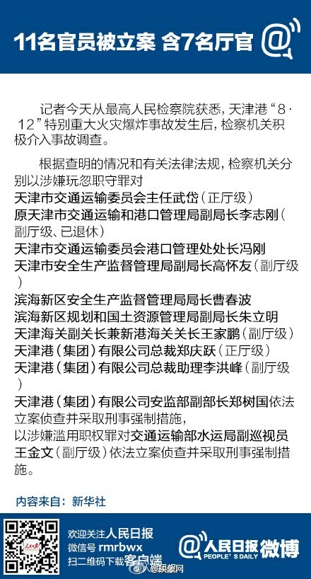 天津交通委主任武岱(正廳)、原天津交通運(yùn)輸和港口管理局副局長李志剛(副廳、已退休)、天津安監(jiān)局副局長高懷友(副廳)、天津海關(guān)副關(guān)長王家鵬(副廳)、天津港集團(tuán)總裁鄭慶躍(正廳)、總裁助理李洪峰(副廳)、交通部水運(yùn)局副巡視員王金文(副廳)。