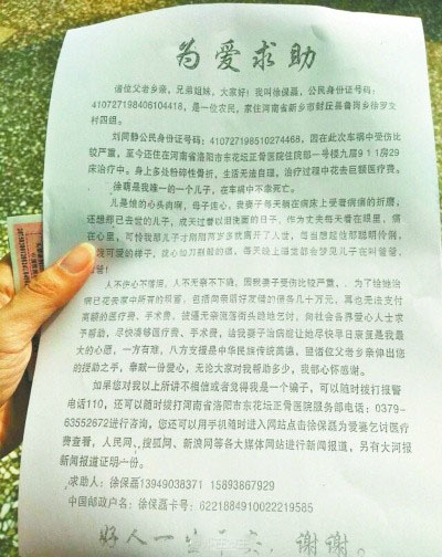 近日,有網(wǎng)友發(fā)微博稱,鄭州火車站候車廳,有個(gè)自稱徐保磊的人向旅客挨個(gè)散發(fā)傳單,稱妻子因出車禍住院無錢治療,向旅客乞討求助。經(jīng)多方調(diào)查:當(dāng)事人已出院兩年多,發(fā)傳單的不是徐保磊本人。大家不要上當(dāng)啊!