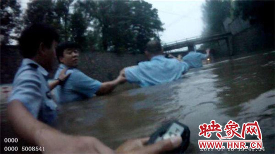 7月16日19時(shí),新密市突降暴雨。19時(shí)30分許,正在附近執(zhí)行任務(wù)的新密市公安局西大街派出所民警呂鵬輝和輔警張靖、韓耀鵬、張文龍、張永康等接110指令:于家崗鐵路橋處有人被困在水中,請馬上前去解救。