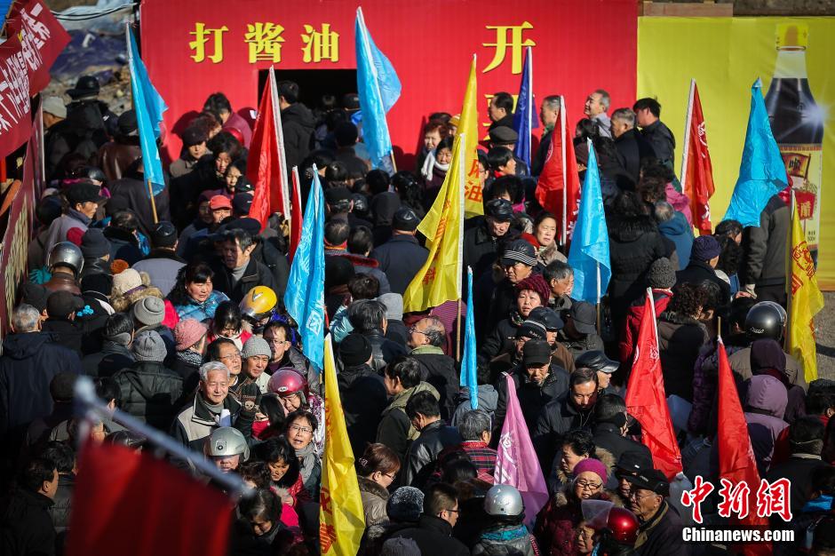 2月8日,江蘇鎮(zhèn)江一家百年老字號(hào)企業(yè)設(shè)立臨時(shí)供應(yīng)點(diǎn),為排隊(duì)前來(lái)的市民免費(fèi)“打醬油”。每年春節(jié)前排隊(duì)“打醬油”是當(dāng)?shù)孛癖娨呀?jīng)延續(xù)了20多年的習(xí)慣,打了醬油,春節(jié)就有了年味。據(jù)介紹,今年打醬油時(shí)間從2月8日至16日,預(yù)計(jì)將有上萬(wàn)人前往排隊(duì)“打醬油”。中新社發(fā) 泱波 攝