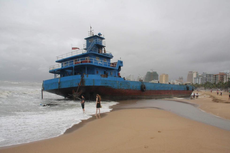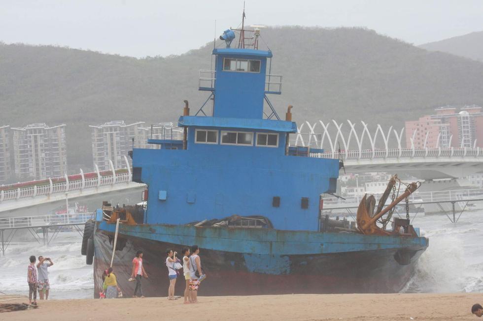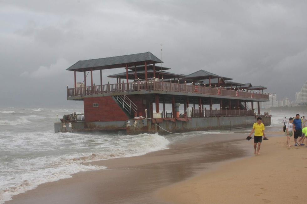 2015年6月23日,海南三亞,“鯨魚”臺(tái)風(fēng)襲擊海南省萬(wàn)寧市,三亞海面大風(fēng)大浪,2艘大型貨輪和一艘旅游船,被刮到了三亞灣沙灘上。