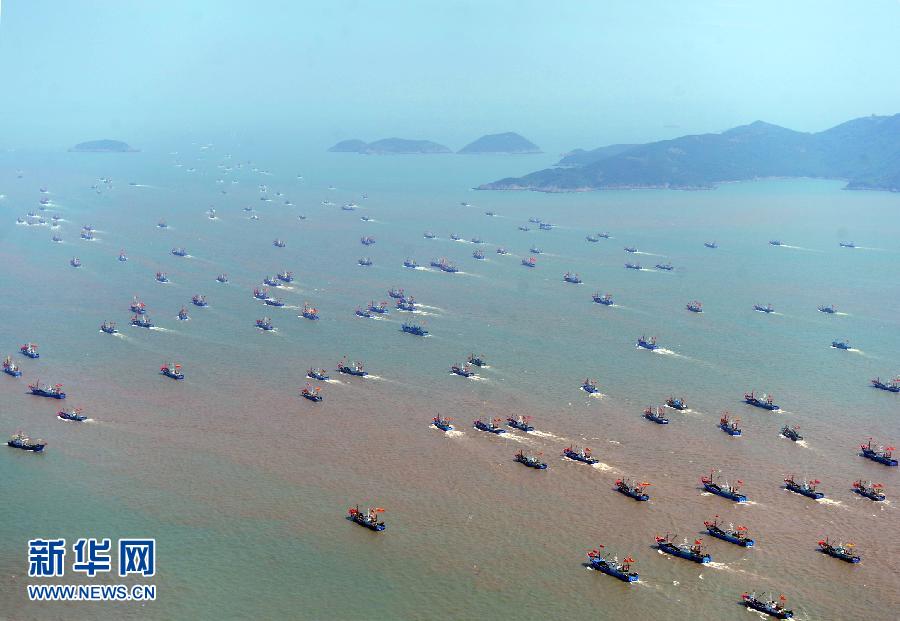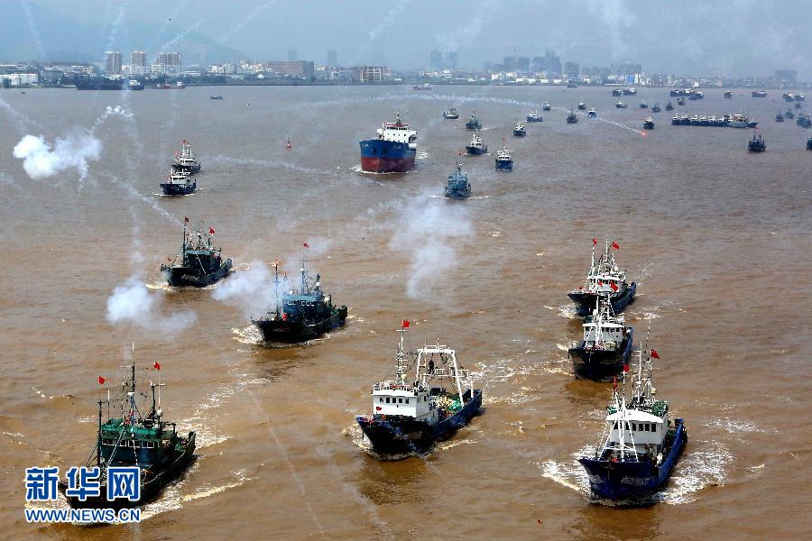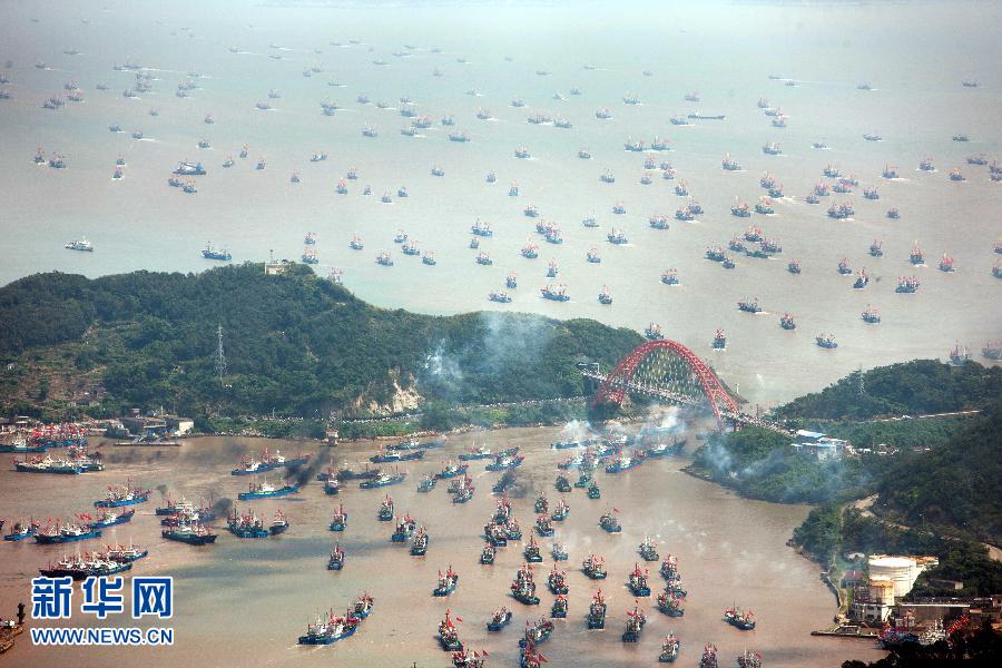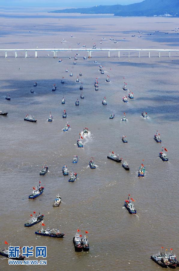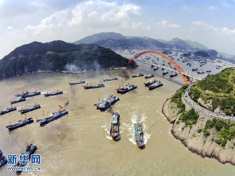 9月16日,浙江省舟山市沈家門漁港的漁船出港經(jīng)過朱家尖大橋開赴漁場。當日,為期3個半月的東海伏季休漁結束,眾多漁船劈波斬浪,開往漁場。   新華社發(fā)(華志波 攝)