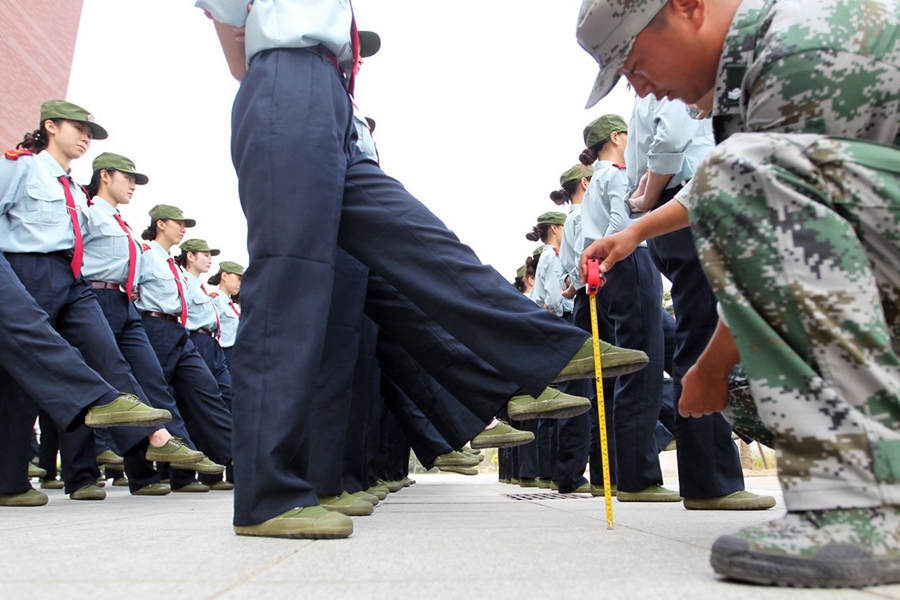“以前上初中和高中都進(jìn)行過軍訓(xùn),但像這樣每一個(gè)動(dòng)作都有硬性指標(biāo)的還是第一次,難度確實(shí)大。頂著瓶子的時(shí)候,開始還好,后來稍不留神瓶子就容易掉下來。”一位新生說。圖為2015年9月17日,鄭州航院的“準(zhǔn)空姐”們正在軍訓(xùn),踢正步卷尺測(cè)量。