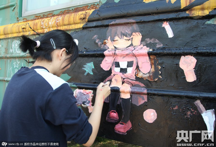 2015年10月10日,鄭州四禾美術(shù)中學充分發(fā)揮美術(shù)生的優(yōu)勢,對火車車身1進行涂鴉改造,使火車宿舍看起來更加漂亮。