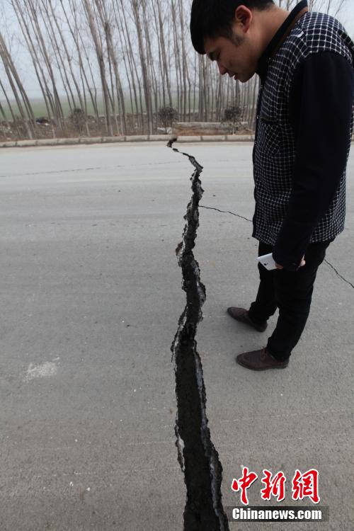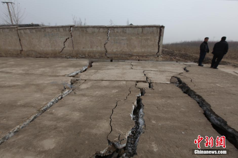 12月25日,山東平邑,位于平邑縣保太鎮(zhèn)的玉榮商貿(mào)有限公司石膏礦發(fā)生坍塌事故。圖為因塌陷開裂的道路。視覺(jué)中國(guó)供圖