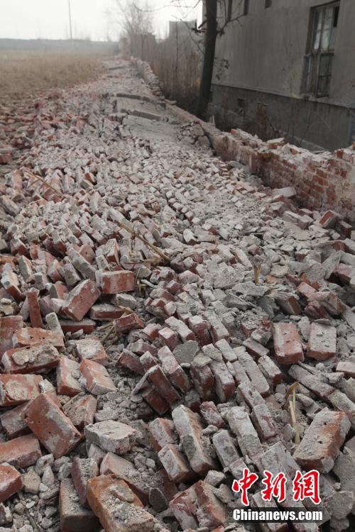 12月25日,山東平邑,位于平邑縣保太鎮(zhèn)的玉榮商貿(mào)有限公司石膏礦發(fā)生坍塌事故。圖為倒塌的院墻。視覺(jué)中國(guó)供圖