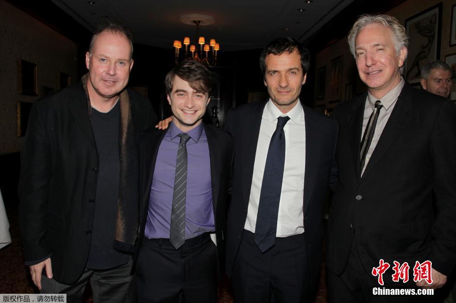 圖為2011年11月21日,電影《哈利·波特與死亡圣器2》導(dǎo)演大衛(wèi)·耶茨(David Yates,左)、男主角丹尼爾·雷德克里夫(Daniel Radcliffe)等人與阿倫·瑞克曼(Alan Rickman,右)在紐約合影。
