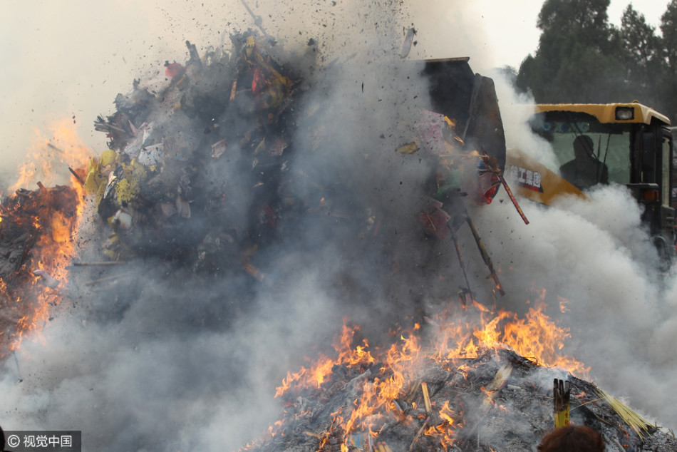祈?,F(xiàn)場(chǎng),濃濃的煙霧讓人睜不開(kāi)眼,兩輛大型鏟車(chē)不停地處理燃燒物,幾十個(gè)工作人員甚至用上了滅火器來(lái)處理殘留物。供圖:視覺(jué)中國(guó)