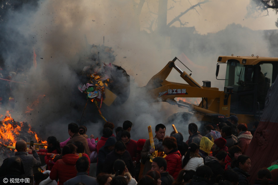 太昊陵廟會(huì)上燒高香的群眾和清理香火的鏟車(chē)。供圖:視覺(jué)中國(guó)