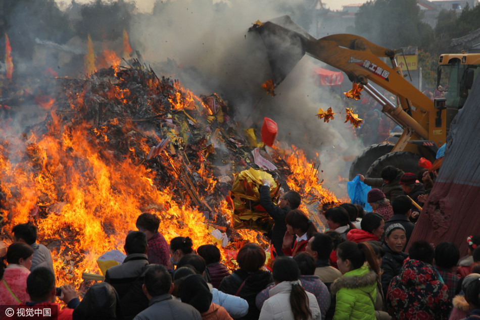 2016年3月10日,農(nóng)歷二月初二,在河南省淮陽(yáng)縣舉辦的太昊陵古廟會(huì)上,大批香客涌入進(jìn)香。盡管相關(guān)部門(mén)已貼出公告,要求愛(ài)護(hù)環(huán)境,禁燒高香。但仍有許多群眾燃香長(zhǎng)度和直徑也明顯超出規(guī)定,燃燒的祭品堆成小山。供圖:視覺(jué)中國(guó)