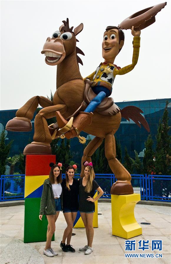 5月15日,參與內(nèi)部測試的游客在上海迪士尼玩具總動(dòng)員酒店的廣場前留影。當(dāng)日,上海迪士尼主題酒店之——玩具總動(dòng)員酒店大堂、廣場、餐廳、度假區(qū)短駁車等區(qū)域及設(shè)施開始內(nèi)部測試。這家共有800個(gè)房間的主題酒店將于6月中旬正式迎客。新華社發(fā)(鈕一新 攝)