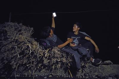 圖為5月12日晚上,村民坐在玉米稈上搜尋手機信號,村里沒有發(fā)射塔,全靠山下發(fā)射到的微弱信號接收手機短信和打電話。9點多鐘,勒爾小學(xué)校長吉克拉者帶著15個孩子到山下,其中有陳古吉的5個孩子,4個女孩1個男孩,最小的男孩叫陳木黑,6歲,讀學(xué)前班。爬山開始前,陳木黑被陳古吉系上背包繩。前面由一個家長引路,中間一個家長,陳古吉帶著陳木黑走最后,6歲的陳木黑已經(jīng)在這條路上,上上下下幾十次了。在爬垂直藤梯的時候,陳古吉會從后面微微提繩,讓兒子能夠省點力氣,跟上前面的哥哥姐姐。在通過沒有任何附著物的崖壁上的道路時,陳古吉就格外小心,緊抓繩子的手有時青筋暴起。他說,前些日子,一個娃滑了一下,幸好崖邊的藤條擋住了,才撿回一條命。