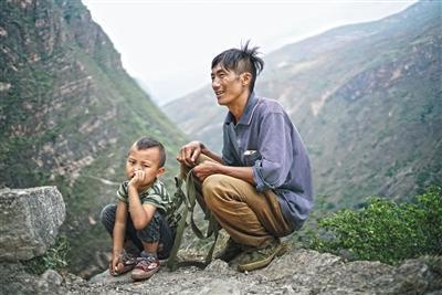 圖為5月14日,爬山開始前,陳古吉用背包繩繞過兒子的胸口,在背后打上結(jié),以確保兒子的安全。上學(xué)的孩子都背著沉沉的書包,大多數(shù)是女孩,15個孩子在三個家長的保護下,大約用了2個小時,到達“懸崖村”。上山容易下山難,遇到雨雪天氣,村里人就不再外出了。由于安全和貧困問題,阿土勒爾村一些適齡兒童還沒有進過學(xué)校。支爾莫鄉(xiāng)黨委書記阿皮幾體告訴記者,阿土勒爾村口口相傳的歷史可追溯到200年前。那時,阿土勒爾村與世隔絕,因為阿土勒爾村特殊的地理位置,沒有匪患,沒有戰(zhàn)亂。這里土地肥沃,村民自給自足,生活比動蕩不安的其他地方要安逸而且富庶得多。阿皮幾體說,如今外面道路通暢,物流通暢,商業(yè)發(fā)達,阿土勒爾村落在了后面。