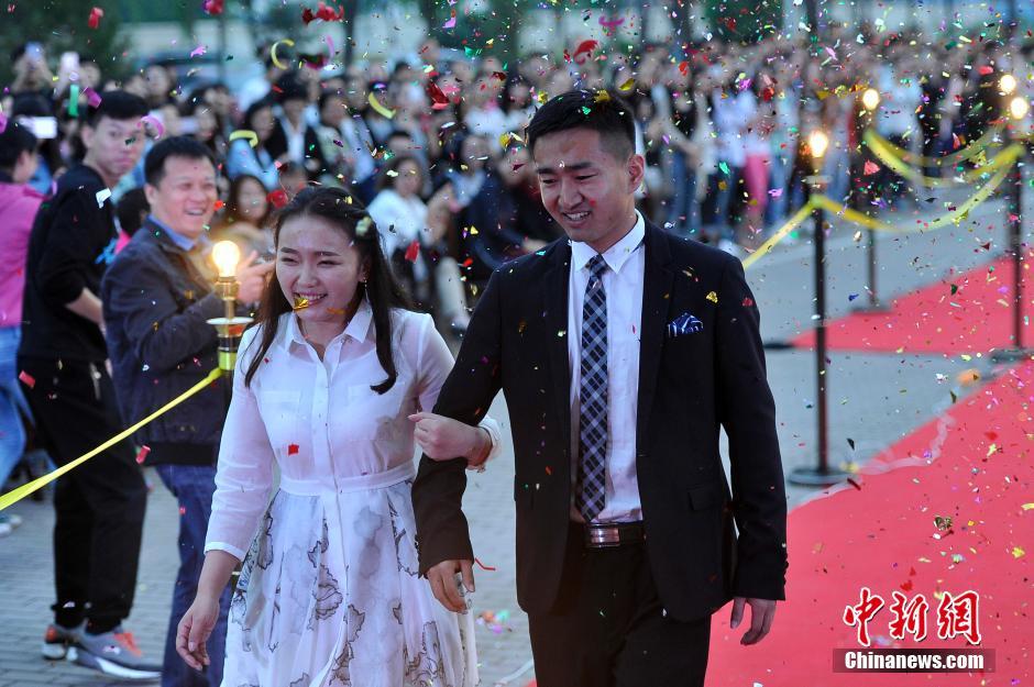 6月3日晚,山西大學(xué)美術(shù)學(xué)院畢業(yè)典禮,大學(xué)畢業(yè)生通過(guò)紅地毯走進(jìn)會(huì)場(chǎng),學(xué)弟學(xué)妹們夾道歡迎。當(dāng)畢業(yè)生情侶一起走秀時(shí),引起學(xué)弟學(xué)妹們一陣尖叫。韋亮 攝