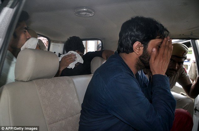 受害女子稱:“我離開(kāi)學(xué)校,看見(jiàn)了他們,相同的5個(gè)人。我非常害怕?!笔芎θ烁嬖V當(dāng)?shù)匾患译娨暸_(tái),“他們強(qiáng)迫我進(jìn)入車(chē)?yán)?,試圖扼死我。他們威脅說(shuō)要?dú)⑺牢业母赣H和兄弟。”圖為3名涉嫌強(qiáng)奸女子的嫌疑人被捕時(shí),用手遮住臉。