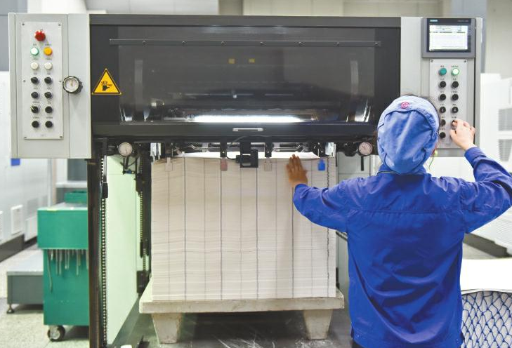 成鈔公司大門口,緊握槍支的武警駐守,在這里,有著嚴(yán)密的安檢措施。在經(jīng)過層層申報審批,暫存隨身攜帶的手包和手機后,記者獲批進(jìn)入生產(chǎn)車間。瞬間,靜謐被機器的轟鳴代替。在車間內(nèi),穿著藍(lán)色工裝的工人正有序忙碌著。在這里經(jīng)過多道印鈔工序及干燥、檢驗等環(huán)節(jié)后,一張張雪白的印鈔紙“搖身一變”,成為紅紅綠綠的鈔票,整個過程前后需要耗時1個月左右。