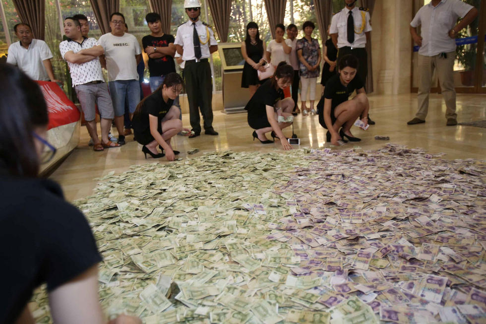 圖為售樓人員數(shù)錢現(xiàn)場。