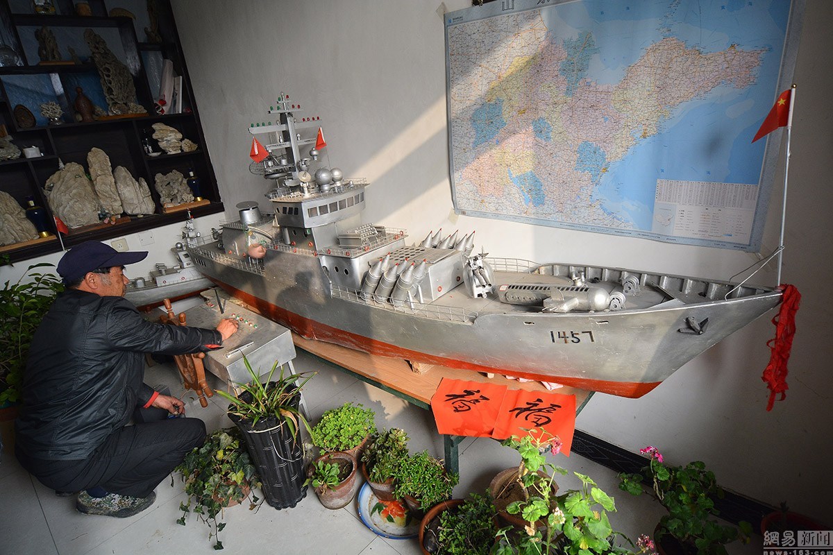 郭長海,初小文化,當(dāng)過27年的船長。2005年,迫于海洋漁業(yè)的枯竭,他將漁船賣掉。但是仍然割舍不了對大海的依戀之情。平時,他喜歡從電視上了解國家大事,最愛看軍事頻道,耳濡目染,于是對軍艦產(chǎn)生了濃厚的興趣。農(nóng)閑的時候,郭長海便琢磨起了艦艇模型的制作。