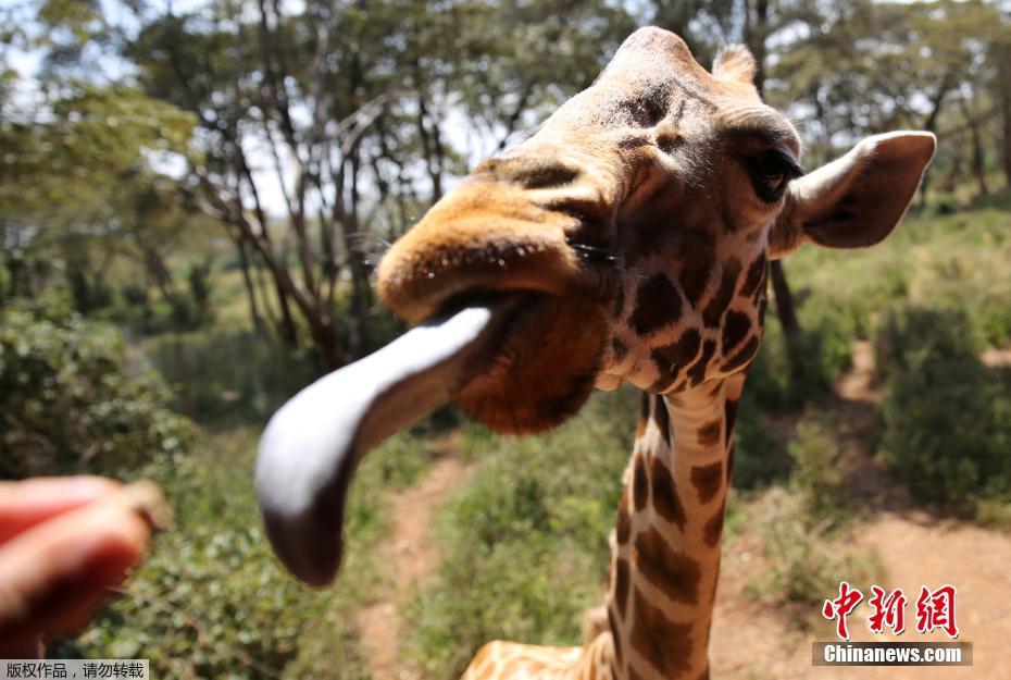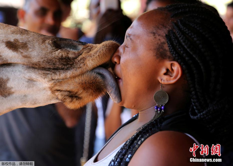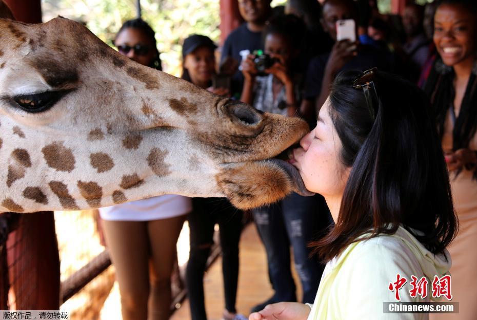 當地時間1月15日,肯尼亞內羅畢的一個動物園內,游客用嘴喂食長頸鹿,人與動物親密接觸,其樂融融。