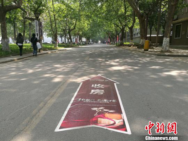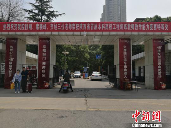 校園內(nèi)貼有收房指示路標(biāo)。記者4月27日在西安建筑科技大學(xué)華清學(xué)院看到,華清學(xué)府城與該校緊鄰,中間有一道門可以進(jìn)出。樓盤交房廣告標(biāo)語(yǔ)張貼于學(xué)校大門的門柱上,寫有“交房臨時(shí)停車由此進(jìn)入”、“46#樓交房現(xiàn)場(chǎng)由此前行”、“熱烈祝賀46#樓盛大交房”等標(biāo)示。