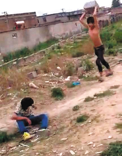 視頻顯示,6分45秒時,一名打人者搬起一塊石頭,向少年背部砸去。隨后,該男子再次搬起石塊,向后走幾米遠,舉起石塊朝少年頭上砸。少年當(dāng)場昏厥,打人者則對著少年臉部撒尿。