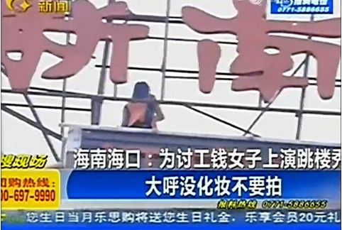 法制晚報(bào):【女子跳樓見(jiàn)記者拍攝:“我沒(méi)化妝不要拍”】近日,海口一名女子為討工錢上演跳樓秀。她坐在大樓樓頂?shù)膹V告牌前,用手抓住廣告牌鐵架,神情激動(dòng)。警方和救護(hù)人員做好準(zhǔn)備隨時(shí)出動(dòng)救援。見(jiàn)到記者拍攝,女子大喊:不要拍了!我今天沒(méi)有化妝,不夠漂亮,很難看!