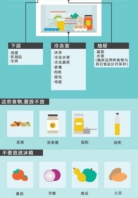 冰箱上層的溫度最為穩(wěn)定,而下層的溫度則最低。飯店常用的一種擺放方法是,把不需要烹飪的食物放在接近冰箱頂部的地方,比如剩菜剩飯、飲料、速食品等。