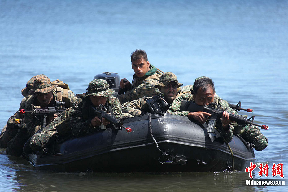 4月25日,美國與菲律賓“肩并肩2012”聯(lián)合軍演參演部隊在菲律賓南部巴拉望省普林塞薩港市的阿魯甘灣舉行“兩棲登陸”演練,美菲雙方近百名海軍陸戰(zhàn)隊士兵參加。這也是美菲“肩并肩2012”聯(lián)合軍演開幕10天以來,開放媒體采訪規(guī)模最大的一場軍事演習(xí)活動。圖為美菲海軍陸戰(zhàn)隊士兵混合編隊,搭乘小艇抵達(dá)演習(xí)地點。張明 攝