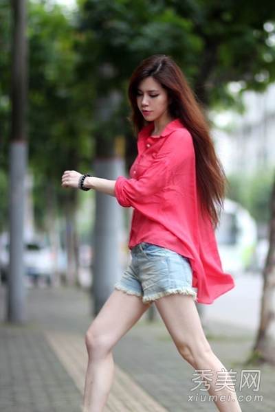 西瓜紅寬松襯衫,前短后長,寬松版型,盡顯歐美風范兒。搭配牛仔短褲,清新迷人,大秀美腿,特別清爽有型哦。