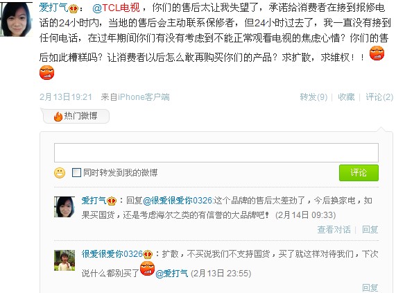 2月13日網(wǎng)友愛打氣首先曝出TCL售后的問題,其表示,TCL電視的售后讓人失望,承諾給消費者在接到報修電話的24小時內(nèi),當?shù)氐氖酆髸鲃勇?lián)系保修者,但一直都沒有兌現(xiàn)。