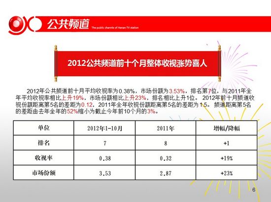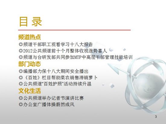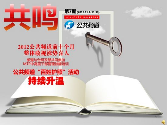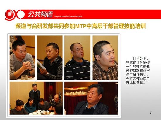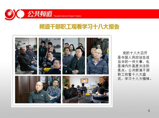 頻道干部職工觀看學習十八大報告,2012公共頻道前十個月整體收視漲勢喜人,頻道與臺研發(fā)部共同參加MTP中高層干部管理技能培訓。