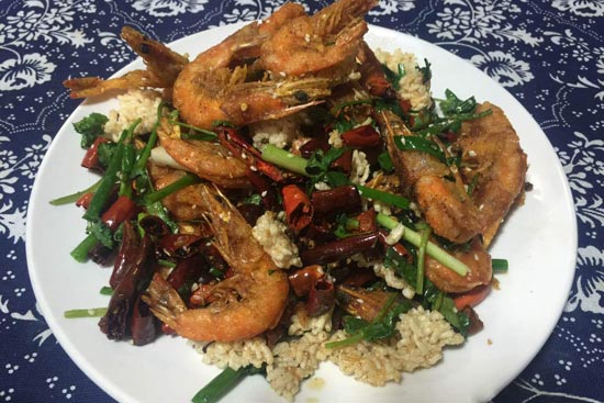 6、鍋內(nèi)留少許底油,將花椒和干紅辣椒炒香,倒入鍋巴和蝦,調(diào)味后翻炒即可。