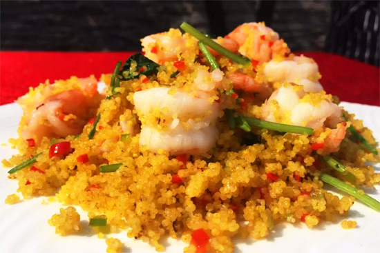 4、青紅尖椒粒炒香,倒入蒸好的小米,加鹽,白糖和胡椒粉調(diào)味,最后倒入蝦仁和香菜翻炒即可。