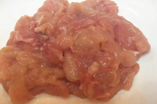 1.先把雞脯肉改刀切成薄片。然后一定要腌制上漿,放入鹽、味精、料酒,抓拌均勻后放入生粉,一定要抄一個(gè)方向使勁打,這樣雞脯肉就不會(huì)柴,會(huì)有滑嫩的口感。