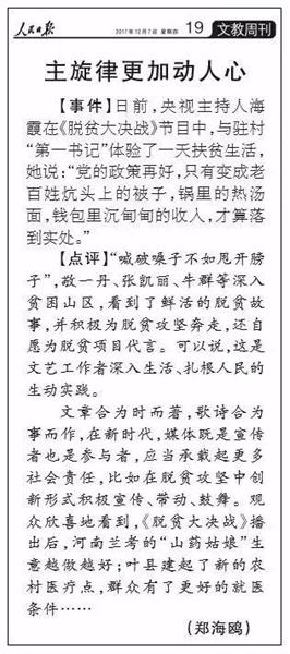 作為十九大的重要獻(xiàn)禮篇,《脫貧大決戰(zhàn)》第二季于10月11日正式播出。從第一季的“認(rèn)識貧困、了解貧困”,到第二季的“幫扶貧困、解決貧困”,固本求新,展現(xiàn)扶貧工作的現(xiàn)實意義和顯著成效,彰顯河南在全國脫貧攻堅中的責(zé)任和擔(dān)當(dāng)。節(jié)目播出之后,《光明日報》刊發(fā)《“土氣”背后的擔(dān)當(dāng)精神——關(guān)于大型公益扶貧節(jié)目<脫貧大決戰(zhàn)>》?!度嗣袢請蟆钒l(fā)表評論《主旋律更加動人心》,稱贊《脫貧大決戰(zhàn)》是“深入生活、扎根人民的生動實踐”,國務(wù)院扶貧辦、中宣部、省委省政府、省委宣傳部等多個領(lǐng)導(dǎo)對節(jié)目給予充分肯定。