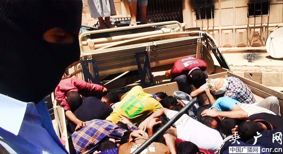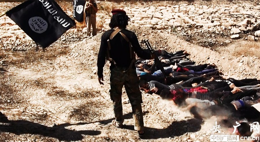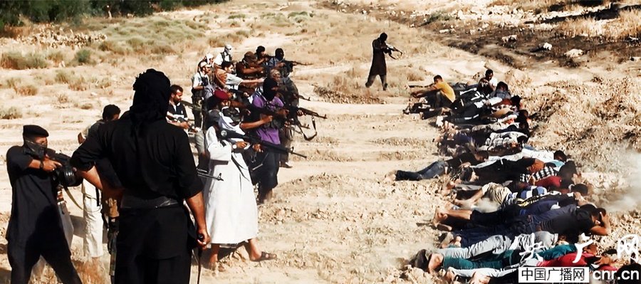 當?shù)貢r間2014年6月14日,伊拉克薩拉赫丁,伊拉克極端武裝“伊拉克和黎凡特伊斯蘭國”武裝人員處決大量俘虜?shù)囊晾耸勘?/p>