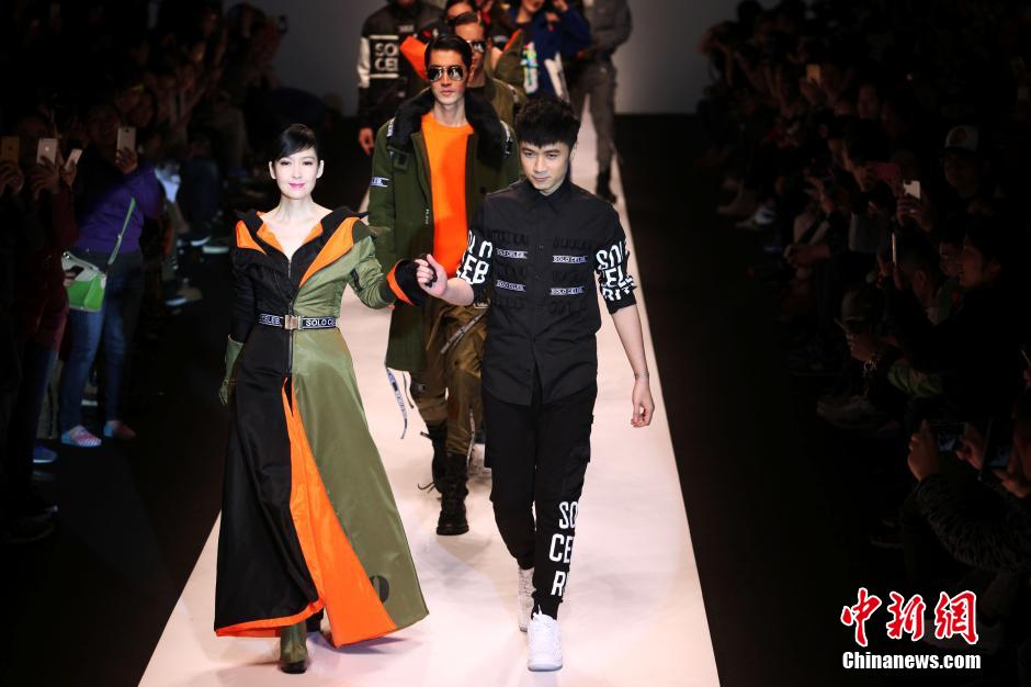 4月13日晚,變身設(shè)計(jì)師的古巨基個(gè)人第一場時(shí)裝發(fā)布會在上海時(shí)裝周舉行。為支持好友首秀,女神周慧敏特意飛到上海,親自登臺走秀,驚艷全場。圖為古巨基與周慧敏共同登臺。 張亨偉 攝
